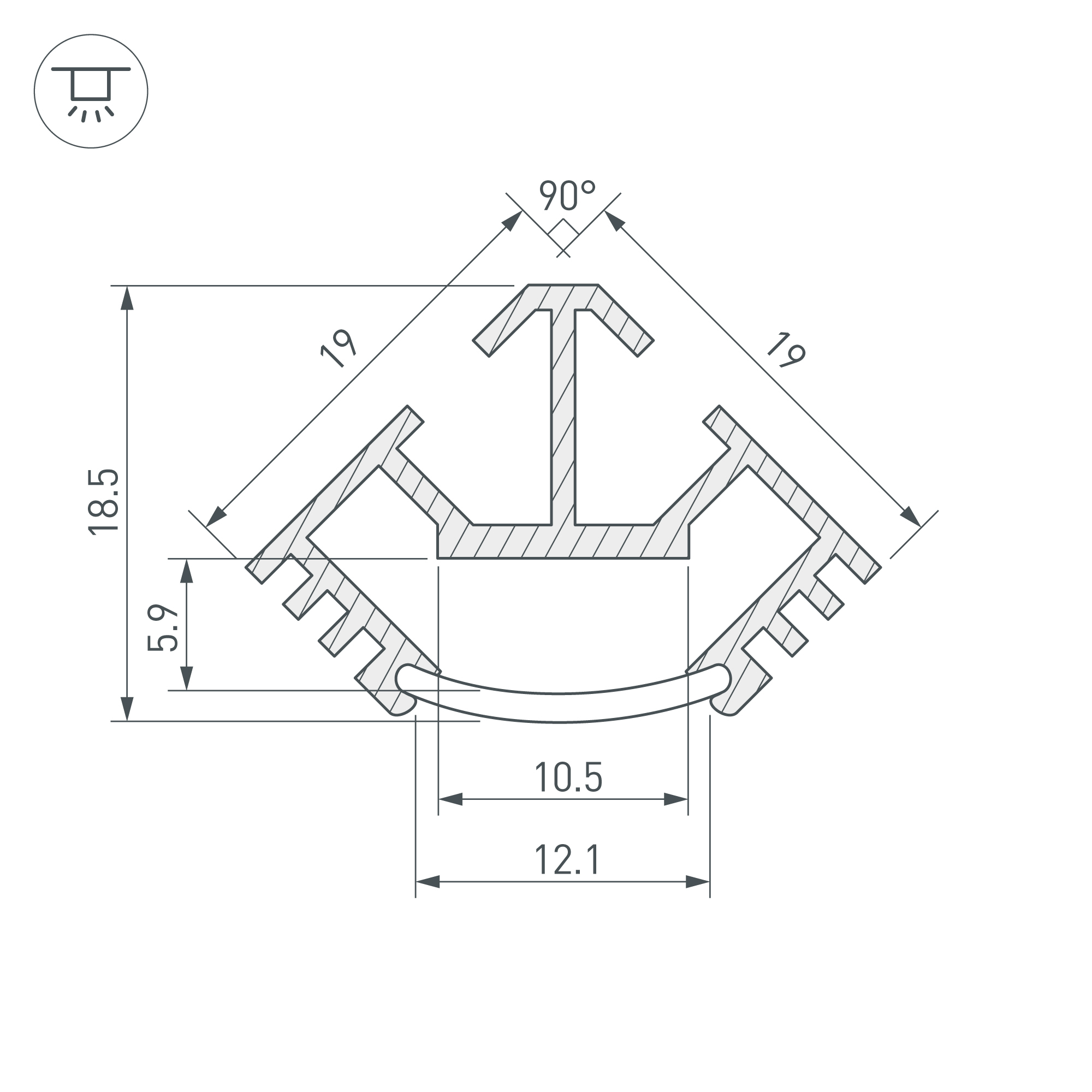 Под заказ от 50 м. Алюминиевый анодированный угловой профиль для светодиодных лент и линеек. Габаритные размеры (L×W×H): 2000x19x19 мм. Ширина площадки для ленты 10,5 мм. Экраны, заглушки и другие аксессуары приобретаются отдельно. Цена за 1 метр.